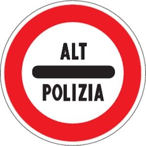 Il segnale raffigurato segnala posto di blocco stradale istituito da organi di polizia al quale è obbligatorio fermarsi